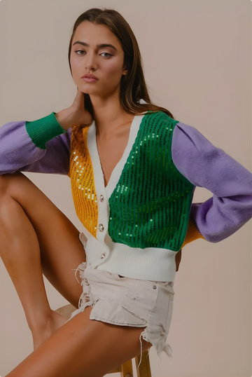 Mardi Gras Color Block Sequin Sweater Cardigan Add sparkle and style to your wardrobe with...